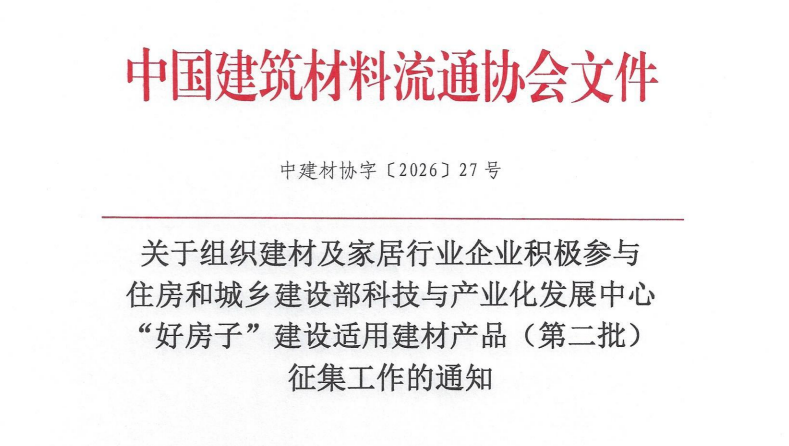 为贯彻落实党中央、国务院关于推进“好房子”建设的决策部署,持续推动新型建材产品应用研究,推广“好房子”建设先进适用建材产品,充分发挥“好材料”对“好房子”建设的支撑作用,住房和城乡建设部科技与产业化发展中心组织开展了“好房子”建设适用建材产品(第二批)征集工作,发布了(建科中心函〔2026〕21号)《关于征集“好房子”建设适用建材产品(第二批)的通知》。中国建筑材料流通协会作为该中心推动好材料流通应用支撑“好房子”建设的战略合作单位,在2025年的第一批征集中成功推荐了9个产品入编《选用指南》,2026年将继续推荐符合要求的“好材料”成为“好房子”建设适用建材产品,经住建部有关专家审查通过的建材产品将编入《面向“好房子”建设好材料选用指南(2026)》。具体征集工作通知如下: